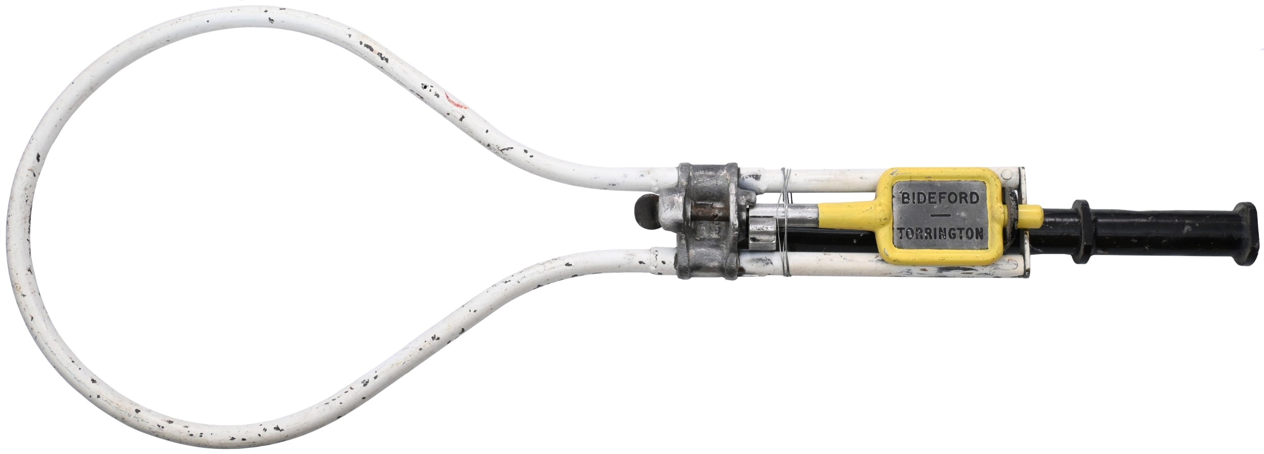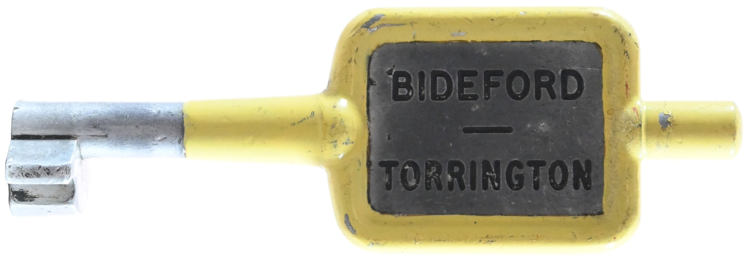 A single line key token, BIDEFORD-TORRINGTON, (alloy), from the Barnstaple Junction to Torrington and Halwill route which closed in 1966. The key is contained in a large hinged carrier. (B)(Dispatch by P&P Agent/Collect from Banbury Depot)