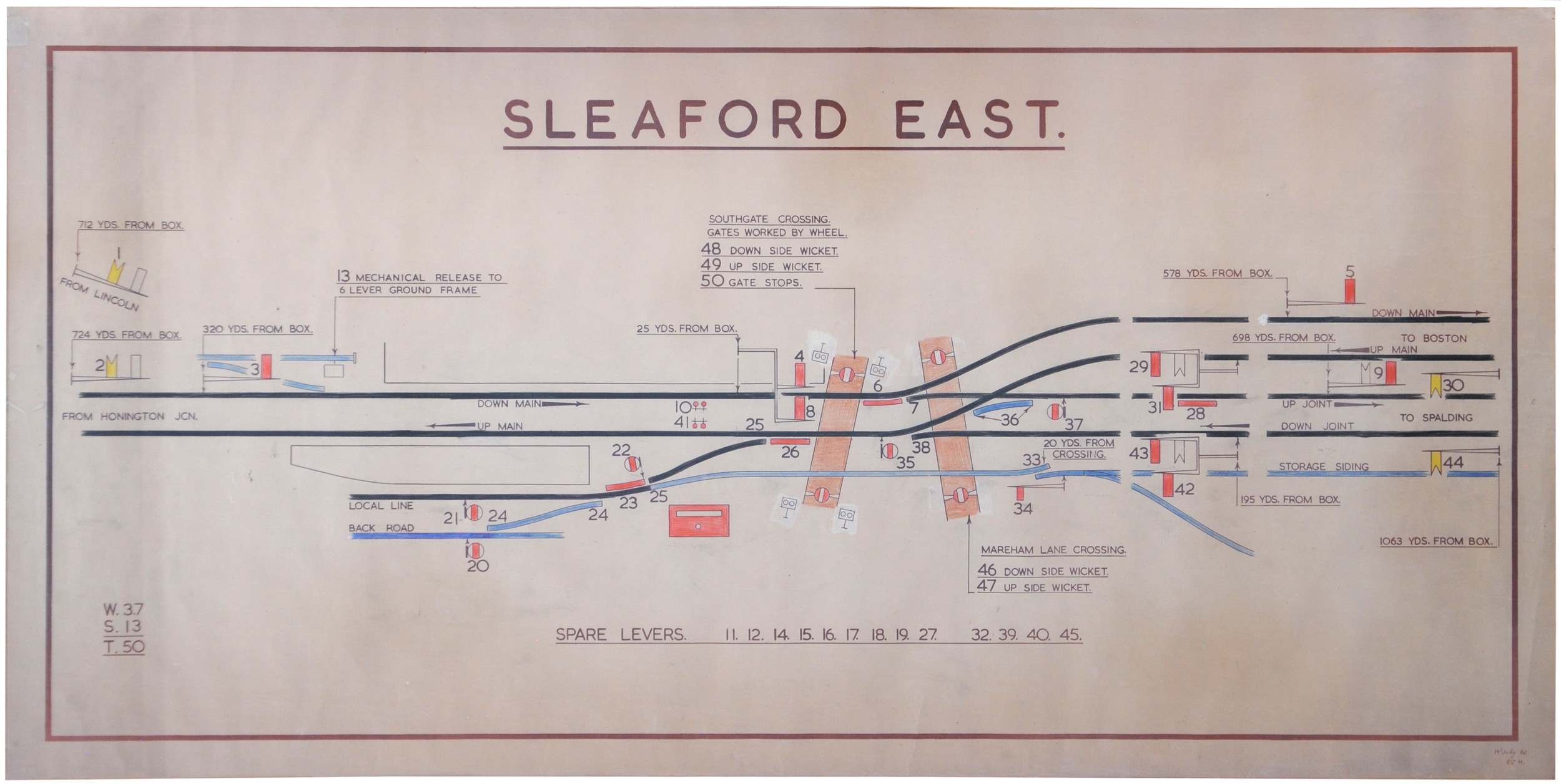 A BR(E) signal box diagram, SLEAFORD EAST, 1962, showing routes from Honnington Junction and to Boston and Spalding, includes station, Southgate and Mareham Lane, crossings. Rolled, 40"x20". (Dispatch by P&P Agent/Collect from Banbury Depot)