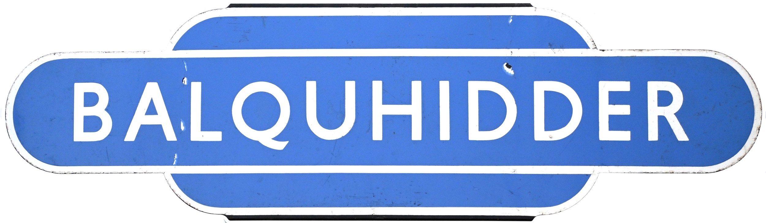 A BR(Sc) totem sign, BALQUHIDDER, (h/f), from the Callander and Oban route, the station situated on the section east of Crianlarich, closed in 1965. Good colour though loss of shine, a crease to the left side and two creases to the right side, the totem restored and varnished long ago. A new restoration would produce a quite presentable totem. (Dispatch by P&P Agent/Collect from Banbury Depot)