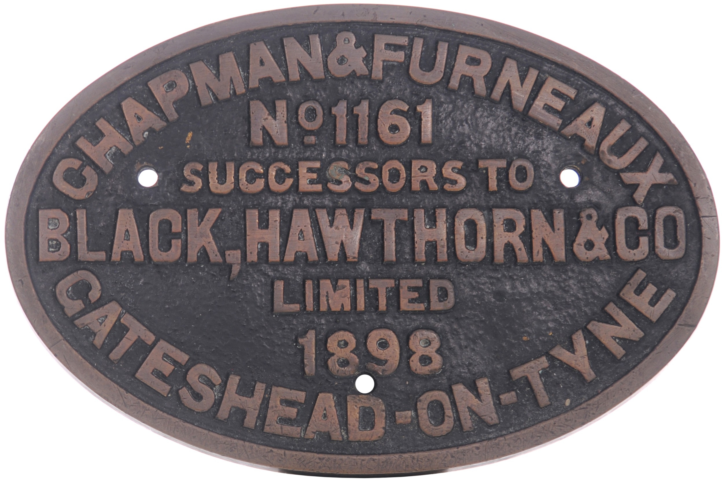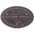 A worksplate, CHAPMAN & FURNEAUX, GATESHEAD-ON-TYNE, No 1161, 1898, SUCCESSORS TO BLACK HAWTHORN AND Co LIMITED, from a standard gauge 0-6-0T new to the Lambourn Valley Railway, Wiltshire and named EALHSWITH. Sold to the Cambrian Railway in June 1904 where it was numbered 26 and lost its name. Taken over by the GWR in 1923 and renumbered 820. Withdrawn March 1930 and sold in March 1931 to the Mells Colliery Company Ltd, Frome, Somerset. Sold in February 1945 to Geo. Cohen, Sons & Co Ltd and scrapped at their Wood Lane depot, West London. A rare main line example from a builder of predominantly industrial locomotives. Cast brass, 11¾"x7¾", the front repainted. (Collect from Banbury Depot/Posted by Woodford Halse Office)