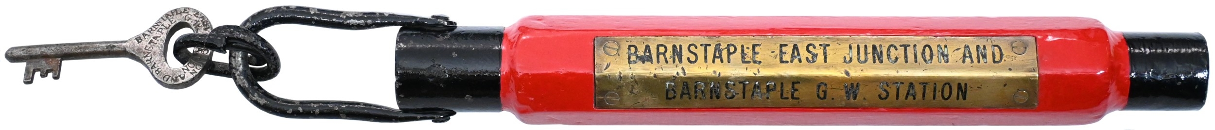 A one engine in steam train staff, BARNSTAPLE EAST JUNCTION AND BARNSTAPLE G.W. STATION, a key attached to the steel handle bears the same wording. This section ran from the GWR Victoria Road Station on the route to Taunton as far as the East Junction. Wood with steel fittings and a substantial engraved brass plate. (Dispatch by P&P Agent/Collect from Banbury Depot)