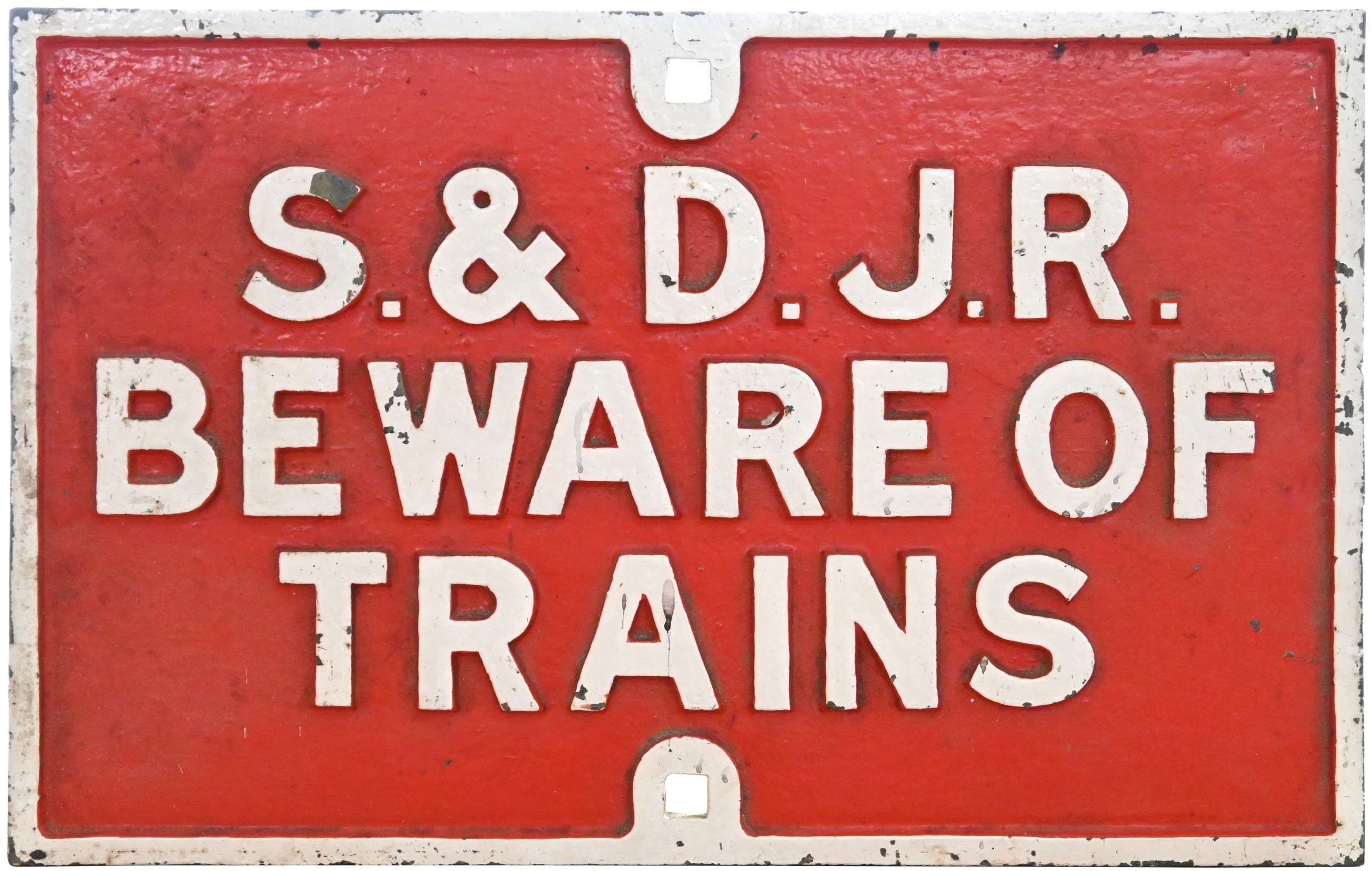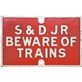 A Somerset and Dorset Joint Railway warning notice, S&DJR BEWARE OF TRAINS. Cast iron, 26"x16¾", repainted, the post mark prominent. (BTSD101) (Dispatch by P&P Agent/Collect from Banbury Depot)