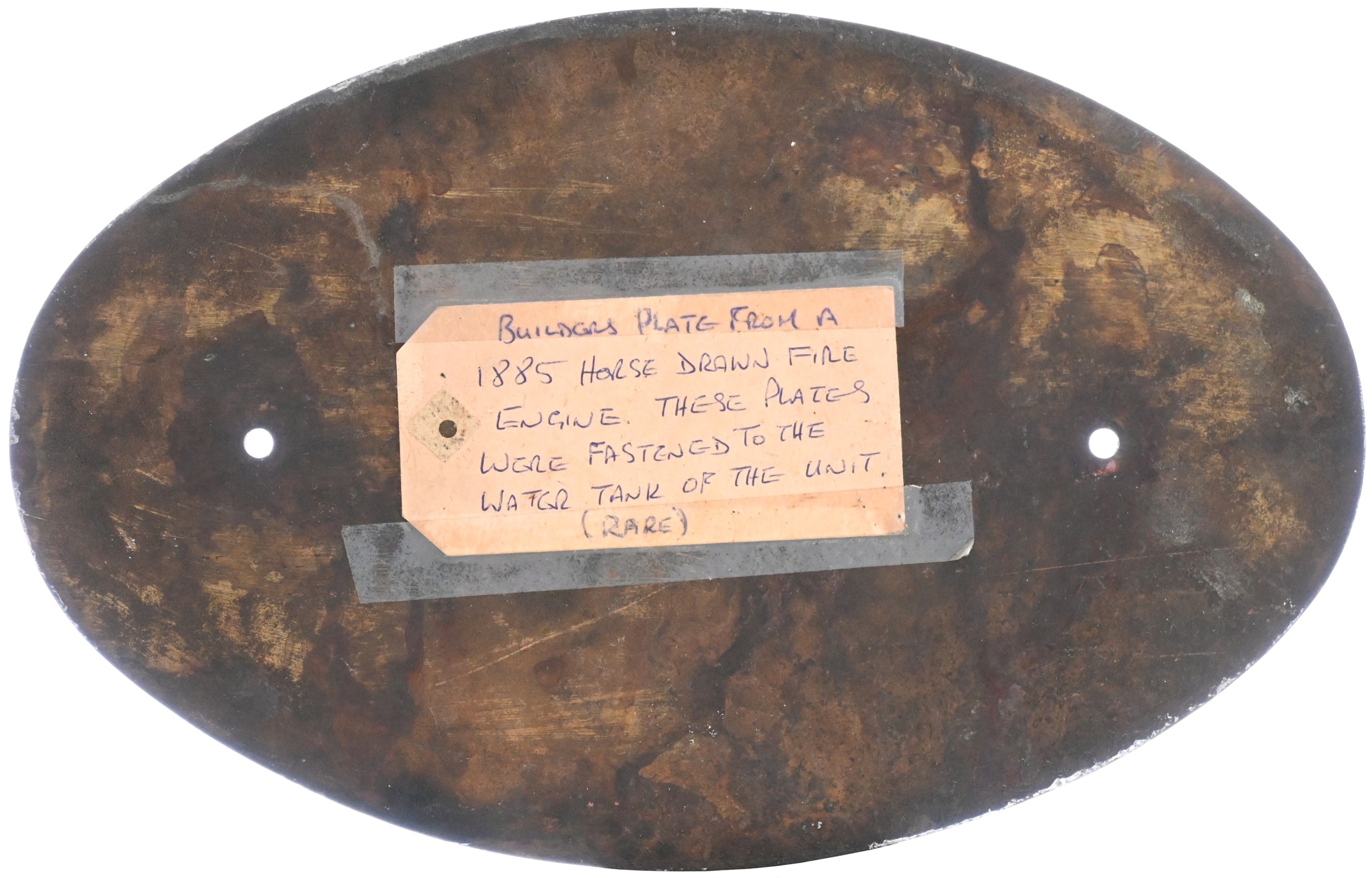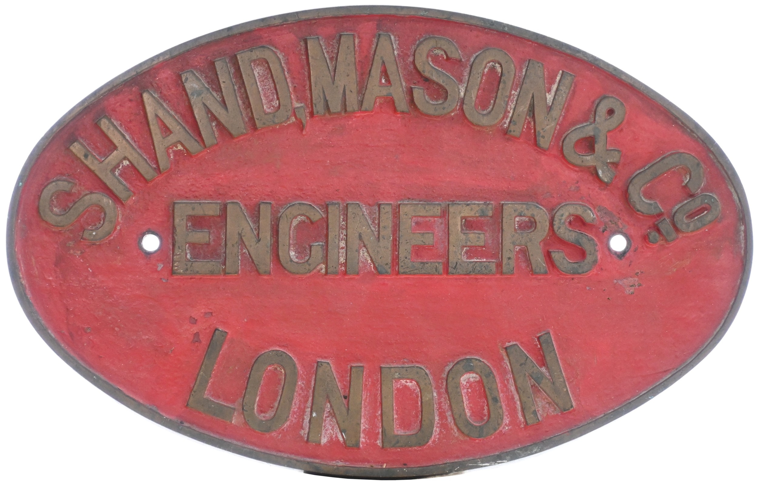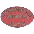 A builders plate, SHAND, MASON & Co, ENGINEERS, LONDON, from am 1885 horse-drawn fire engine, as fitted to the water tank. Cast brass, 12¾"x8¼", the front repainted. (Collect from Banbury Depot/Posted by Woodford Halse Office)