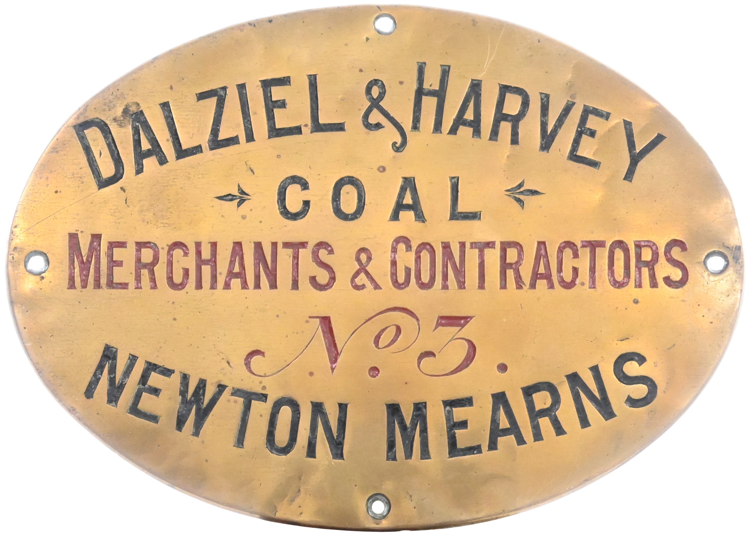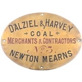 A wagonplate, DALZIEL & HARVEY, COAL MERCHANTS & CONTRACTORS, No 3, NEWTON MEARNS, from a company in Lancashire. Engraved brass, 8"x5¾", the front lightly polished. (Collect from Banbury Depot/Posted by Woodford Halse Office)