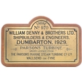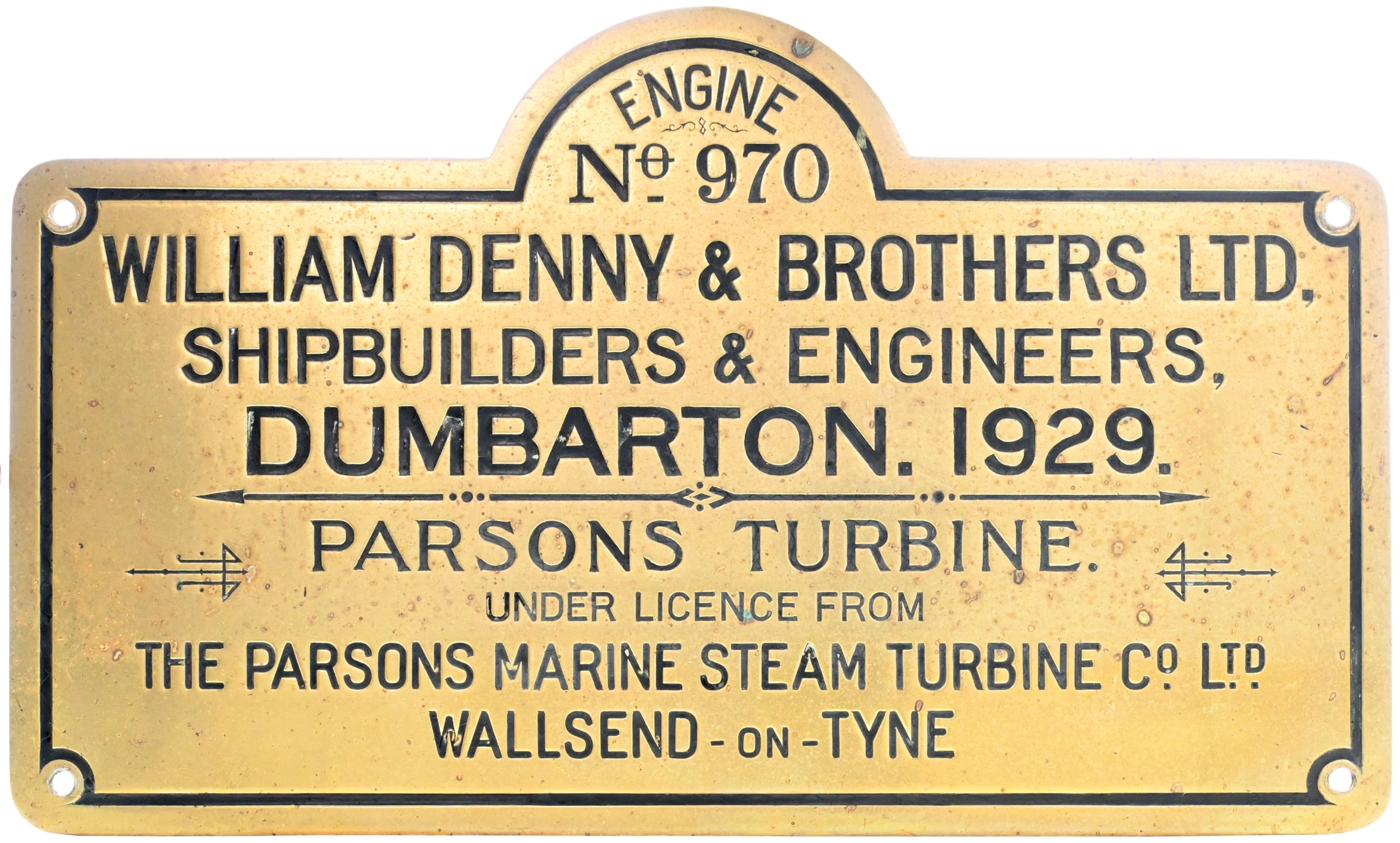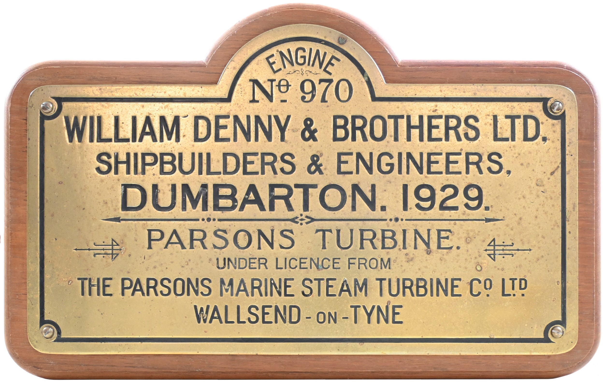 A shipbuilders plate, No 970 WILLIAM DENNY & BROTHERS LTD, DUMBARTON 1929, PARSONS TURBINE UNDER LICENCE FROM PARSONS MARINE STEAM TURBINE Co LTD, WALLSEN-ON-TYNE, from the Southern Railway cross channel steamer, S.S. Canterbury built in 1928. Engraved brass, a substantial and impressive plate, 20"x12", presented on a shaped hardwood mount. (Dispatch by P&P Agent/Collect from Banbury Depot)