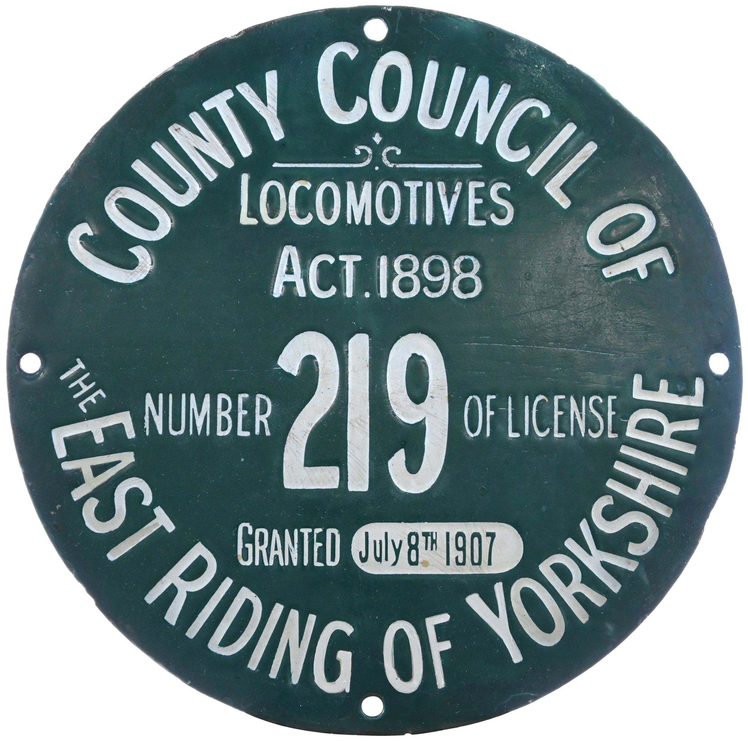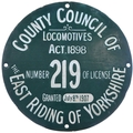 A traction engine plate, COUNTY COUNCIL OF THE EAST RIDING OF YORKSHIRE, LOCOMOTIVES ACT 1898, NUMBER OF LICENSE 219 GRANTED July 8th 1907. Enamel, 8" diameter, one small face chip neatly repainted and chips to edge fixing also restored. (Dispatch by P&P Agent/Collect from Banbury Depot)
