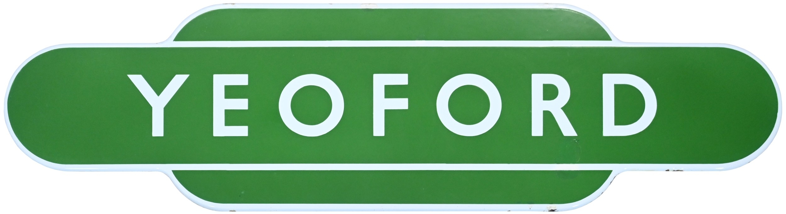 A BR(S) totem sign, YEOFORD, (f/f), from the Exeter to Plymouth main line. Excellent colour and shine, a chip repair below the letter 'R' through the lower white line. (Dispatch by P&P Agent/Collect from Banbury Depot)