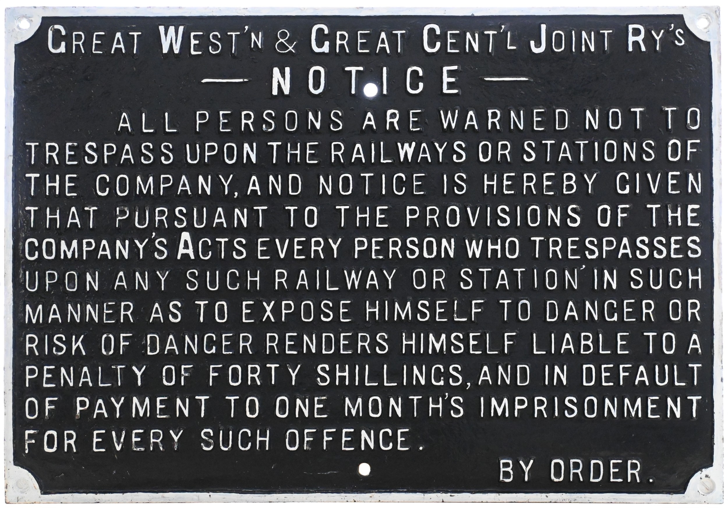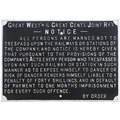 A Great Western and Great Central Joint Railways trespass notice. Cast iron, 29¾"x20¾", repainted. (TPGW102) (Dispatch by P&P Agent/Collect from Banbury Depot)
