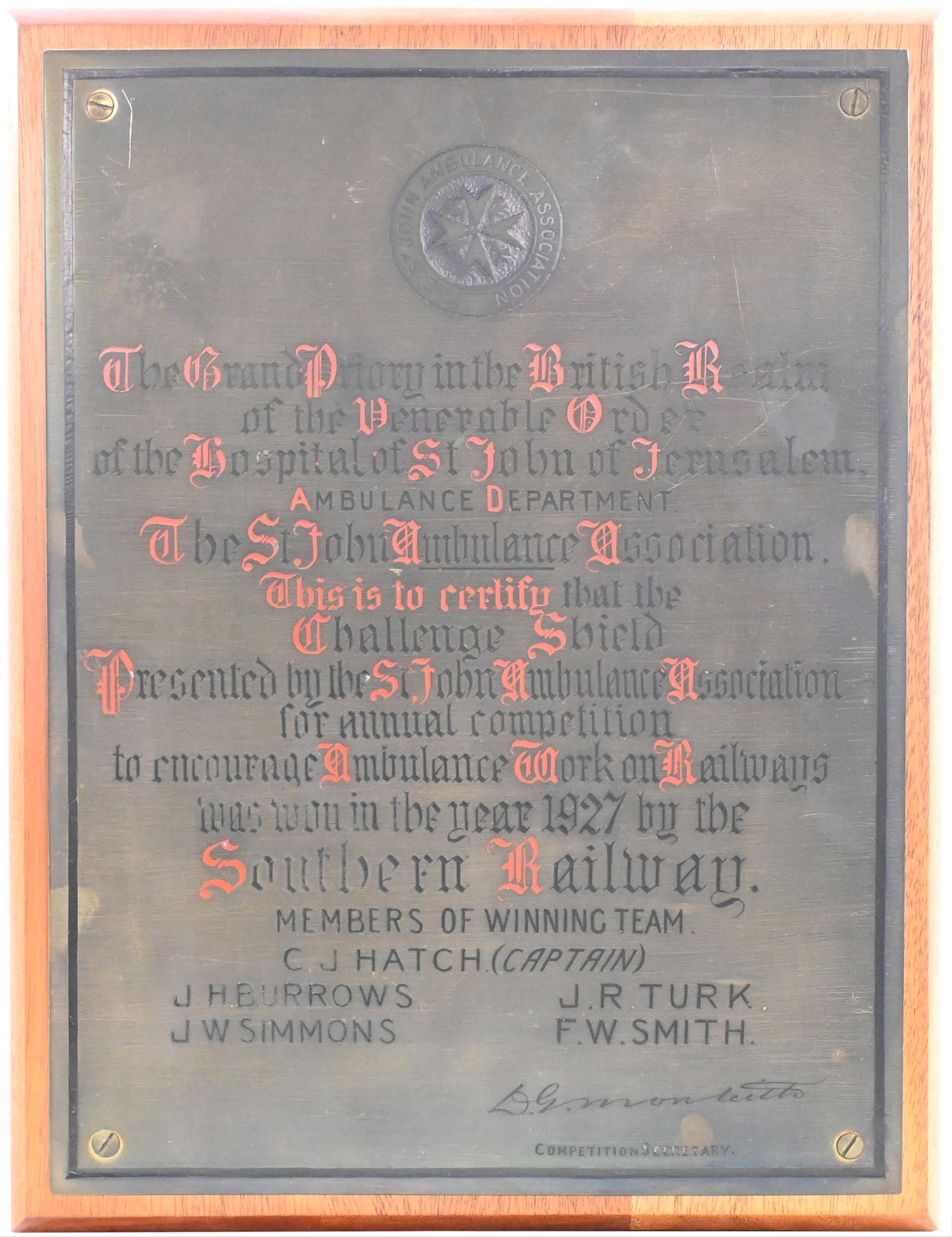 A Southern Railway St John Ambulance presentation plaque stating that the annual challenge shield for 1927 was won by the Southern Railway team. Engraved brass, with black wax filled lettering, the first letter of each word in red, 10½"x13¾", mounted on a chamfered wooden board. (Dispatch by P&P Agent/Collect from Banbury Depot)