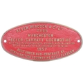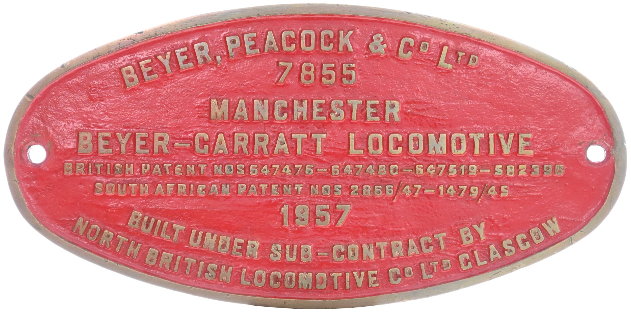 A worksplate, BEYER PEACOCK, 7855, 1957, MANCHESTER, BUILT UNDER SUB-CONTRACT BY NORTH BRITISH LOCO Co GLASGOW, from a 3ft 6in gauge Class GMAM 4-8-2 + 2-8-4 Beyer-Garratt new to the South African Railways as No 4140. The North British Locomotive Co allocated their own Works No 27792. They were the last class of Garratt to see regular service on the SAR and were withdrawn by the mid 1980's. Cast brass, 13¾" x6¾", the front repainted. (Collect from Banbury Depot/Posted by Woodford Halse Office)