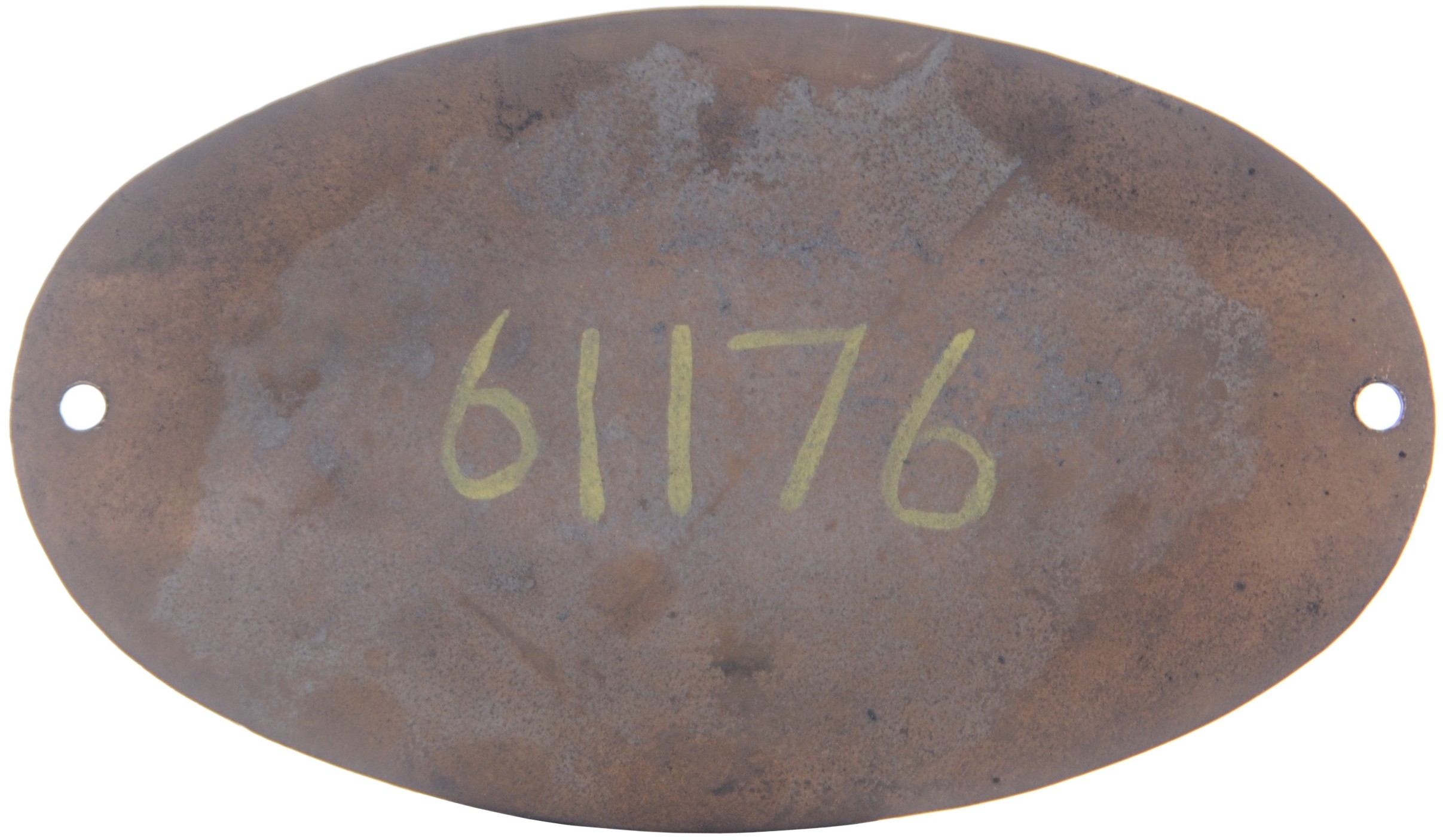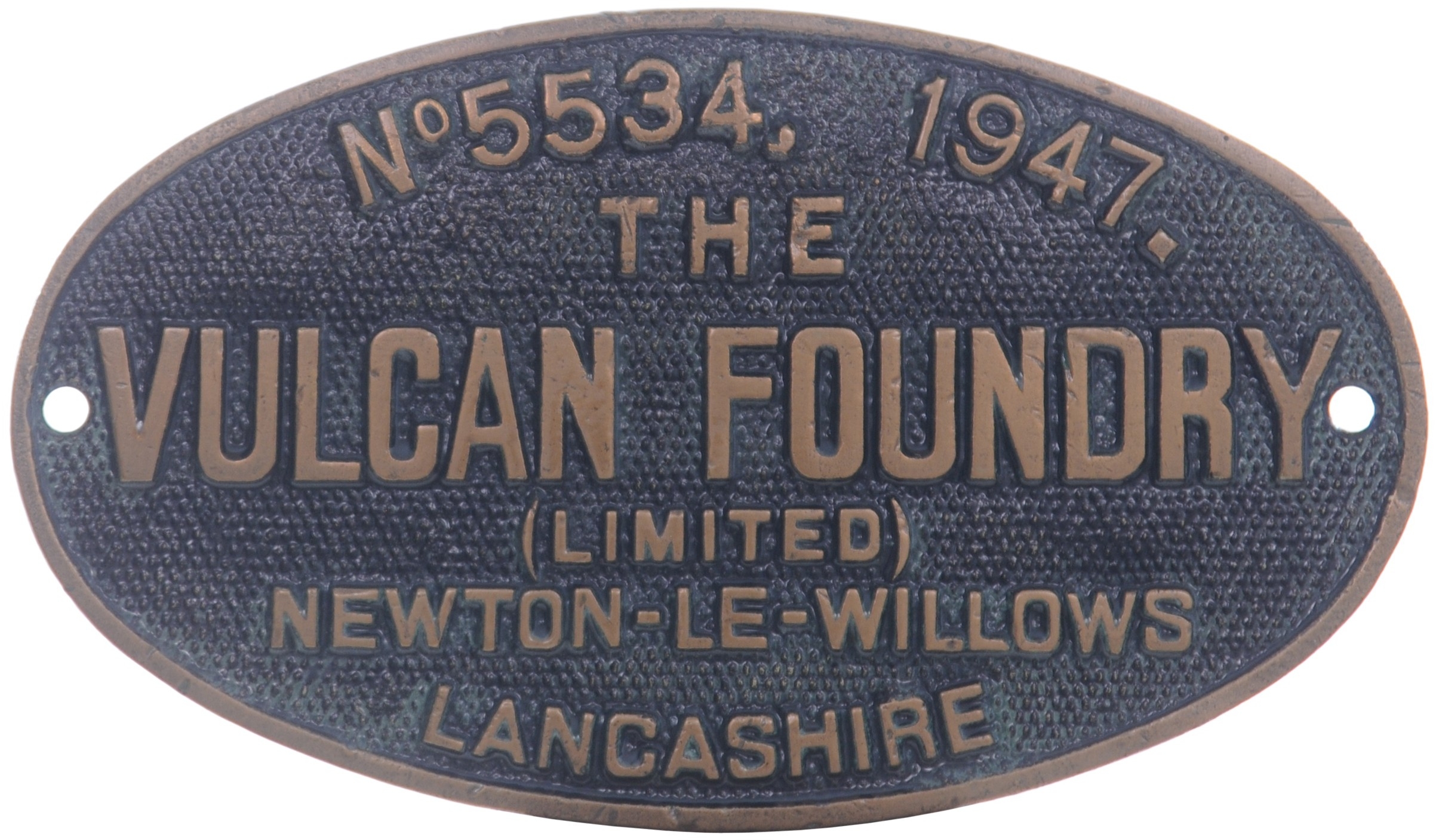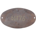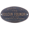 A worksplate, VULCAN FOUNDRY, 5534, NEWTON-LE-WILLOWS, 1947, from a LNER Class B1 4-6-0 1176. Renumbered BR 61176 in 1949. New to Darlington, it was subsequently allocated at York, Darlington, West Hartlepool, Hull Dairycoates and finally York, from where it was withdrawn in November 1965 and sold for scrap the following month to A. Draper of Hull. Cast brass, 9"x5¼", the front repainted. (Collect from Banbury Depot/Posted by Woodford Halse Office)