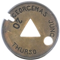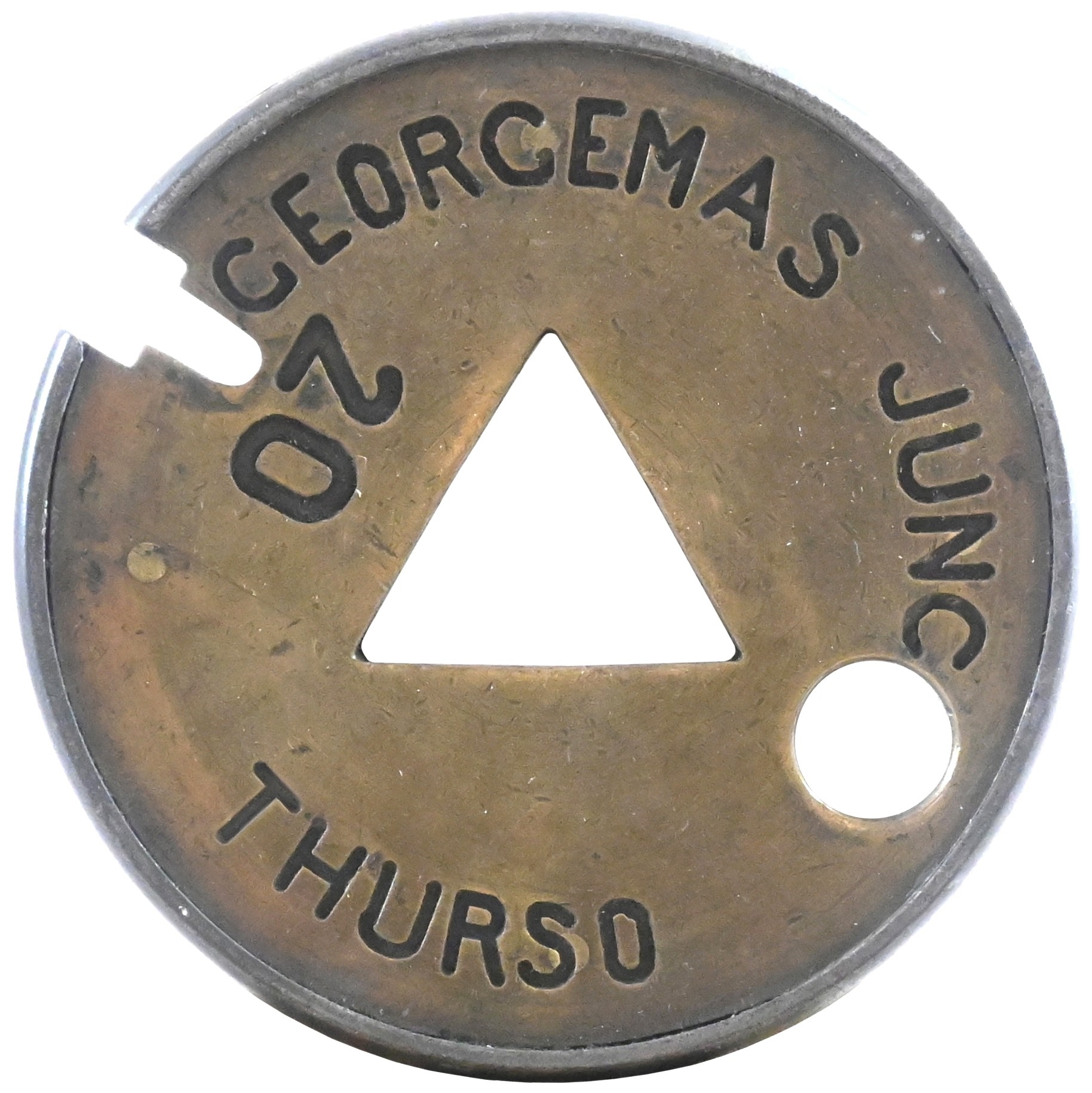 A Tyers No 6 single line tablet, GEORGEMAS JUNC-THURSO, (brass/steel), from the Far North Line. This is the most northerly single line section. (Collect from Banbury Depot/Posted by Woodford Halse Office)