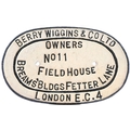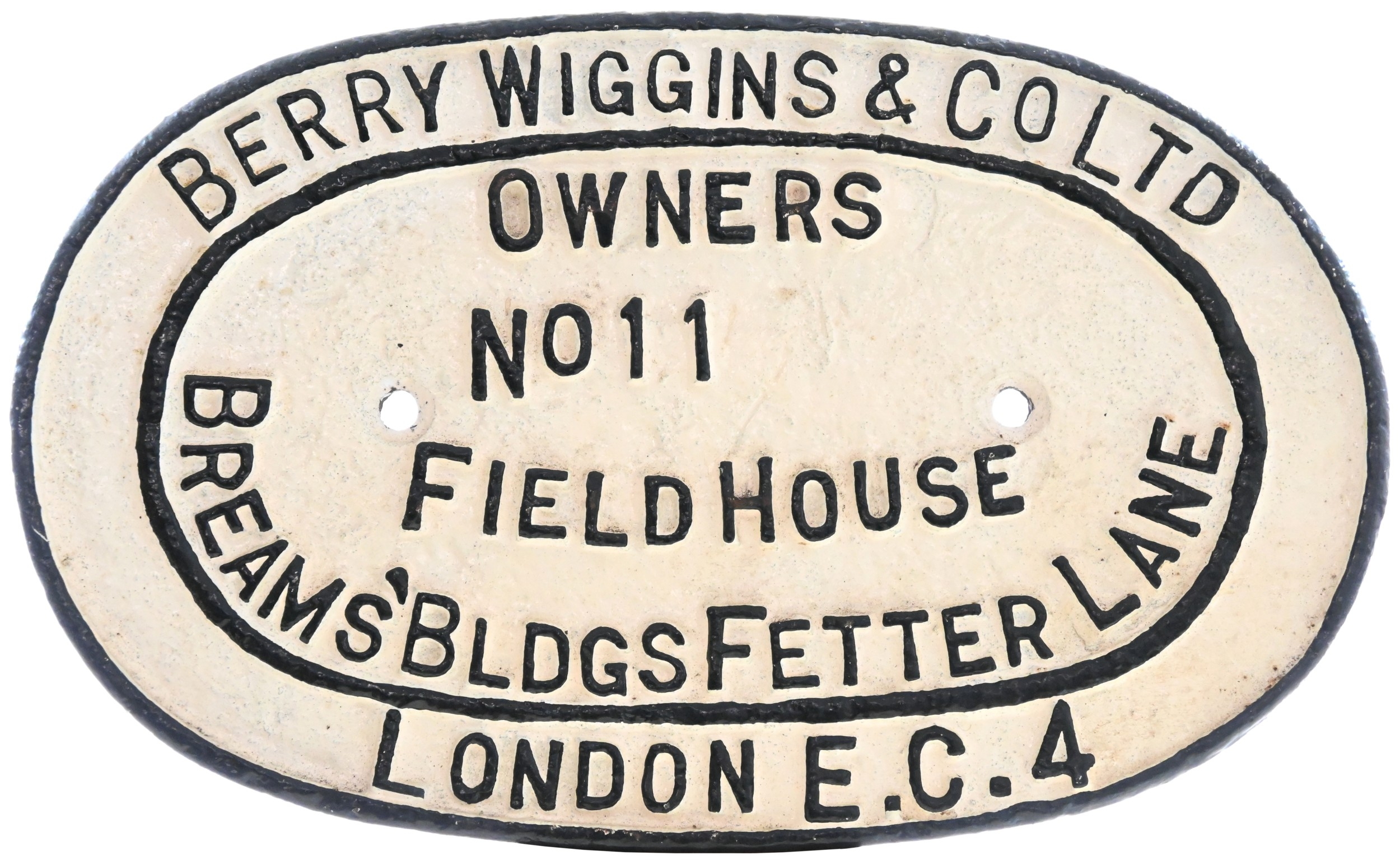 A wagonplate, BERRY WIGGINS OWNERS, No 11, FIELD HOUSE, BREAMS BLDGS, FETTER LANE, LONDON. Cast iron, 11"x6¾", the front repainted. The company were aviation fuel suppliers with a fleet of small tanker wagons. (Collect from Banbury Depot/Posted by Woodford Halse Office)